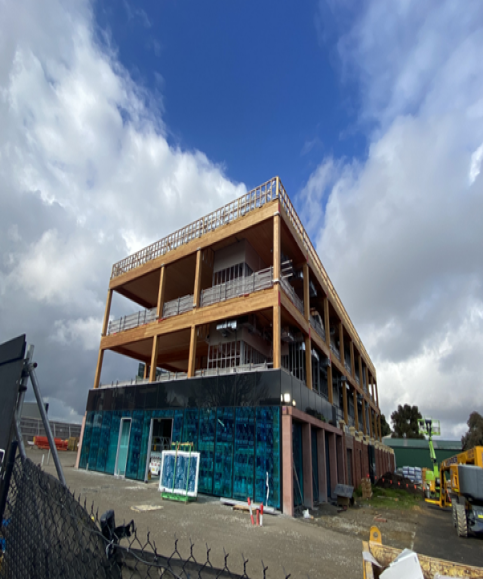 Scope of Works: Install of Unitized Curtain Wall with Feature Sunshade on Timber Structure